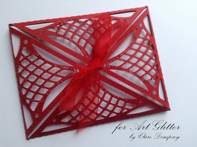This Valentine's Day, Clare wanted to make an envelope as pretty as the card. So, she found an envelope wrap at the Silhouette store that coordinated with a Heartfelt Creations die and cut it in red card stock. She highlighted heart shapes in the pattern by adding Art Glitter Dries Clear Glue using the Ultra fine tip and Art Glitter (see photo above).